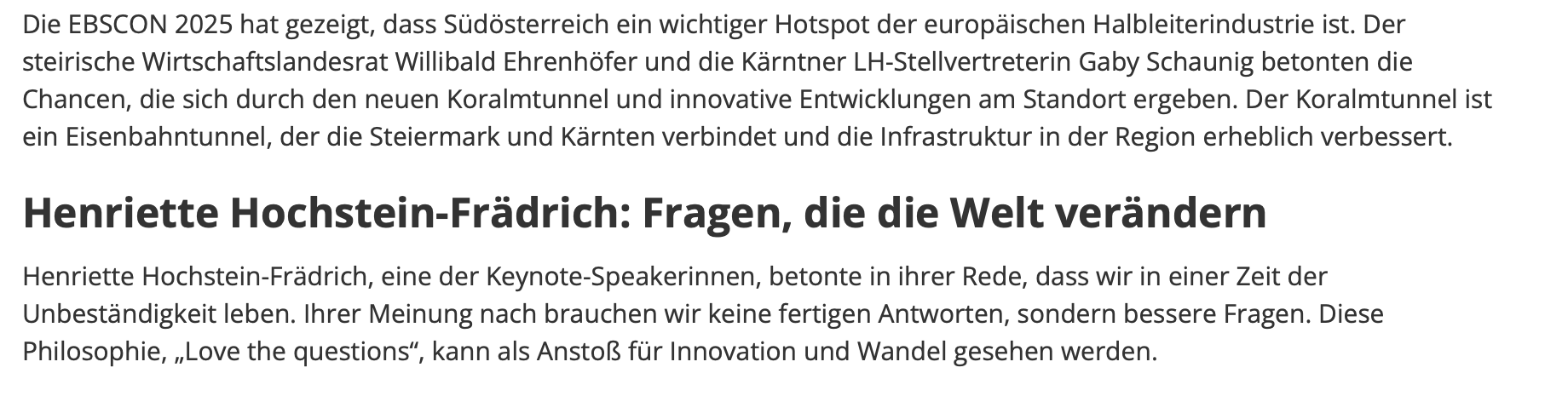 60-minütiger Keynote-Vortrag im Rahmen des internationalen Kongresses EBSCON, Österreichs bedeutendstem Branchenevent für Embedded Systems, Industrial Electronics, Software & Future Tech.