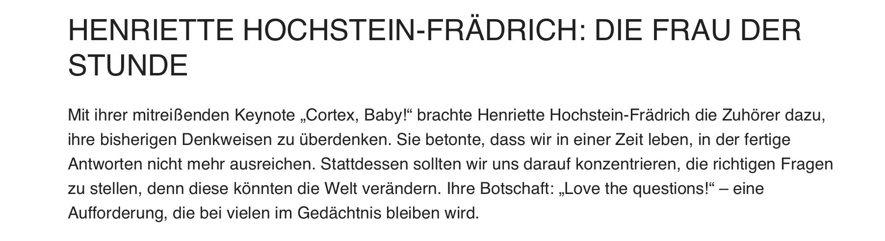 Henriette Hochstein-Frädrich spricht über Transformation, Innovation und radikale Neugier – mit Haltung, Humor und nachhaltiger Wirkung. Jetzt unverbindlich anfragen!
