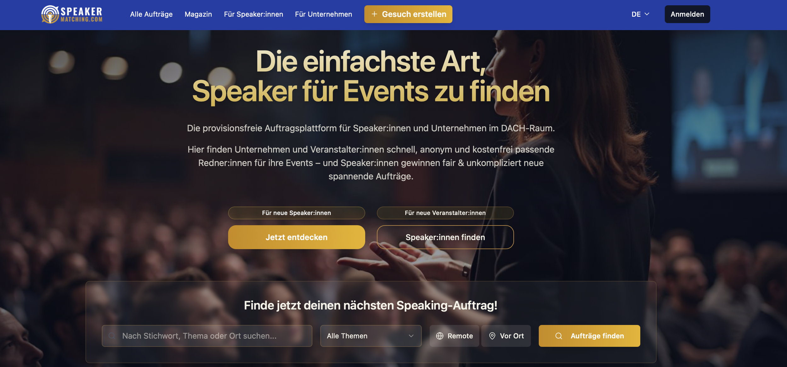 Mit SpeakerMatching.com gründete Henriette Hochstein-Frädrich 2025 die erste Auftragsvermittlungs-Plattform/Jobbörse für Speaker:innen & Trainer:innen einerseits und Unternehmen & Eventveranstalter:innen andererseits. SpeakerMatching.com verbindet mit seinem innovativen und disruptiven Reversemodell Unternehmen & Veranstalter:innen mit passenden Speaker:innen und Trainer:innen – einfach, schnell, effizient, smart und provisionsfrei. Unternehmen finden schnell, anonym und kostenfrei passende Redner:innen für ihre Events - und Speaker:innen gewinnen fair & unkompliziert neue spannende Aufträge und Veranstalter/Unternehmenskontakte.